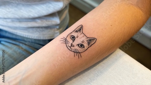 © RisanRisan, Obraz premium Close Up of Micro Realistic Fine Line Tattoo of Cat on Forearm Highlighting Personal and Delicate Body Art