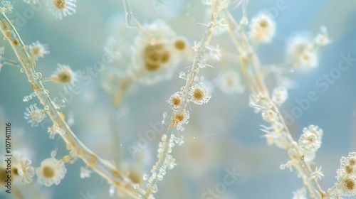 Fototapeta premium Close-up of microscope slide revealing intricate fungal spores, essential for research on fungal diseases and microbiology studies.