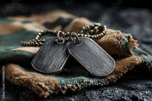 Fototapeta premium Close-up of military dog tags on camouflage fabric. Symbol of service and sacrifice, representing Veterans Day, Memorial Day and honoring fallen soldiers.