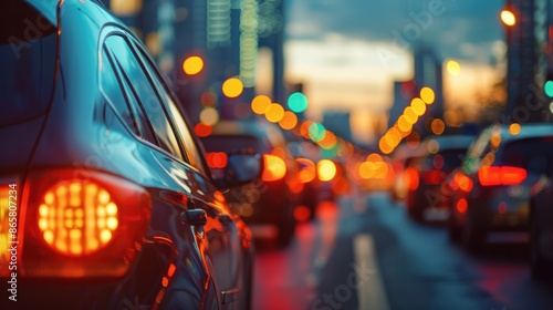© Oulaphone, Fototapeta premium Close up of Modern cars in a traffic jam on the road, with a blurred city background. A summer evening time.