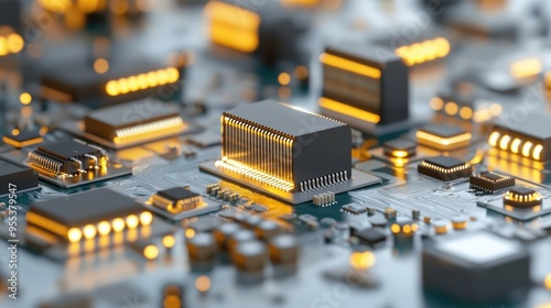 Obraz premium Close-Up of Modern Electronic Circuit Board with Glowing Microchips and...