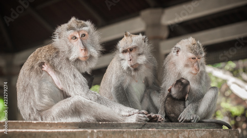 Fototapeta premium Close up of monkey family sitting in sacred monkey forest