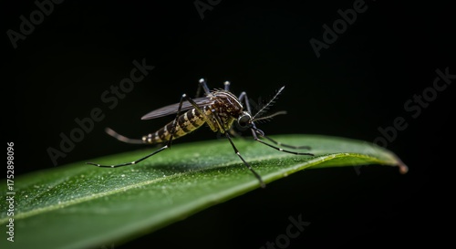 © singgih, Naklejka premium Close-up of Mosquito on Green Leaf in Dark Environment