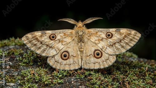 © GMeta, Fototapeta premium Close up of moth on mossy rock wings displaying intricate patterns and eye like markings