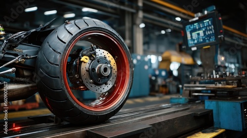 Fototapeta premium Close-Up of Motorcycle Wheel and Tire in Industrial Workshop with Digital...