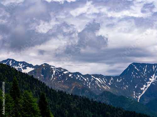 Fototapeta premium Close-up of mountain peaks adorned with snow caps, reflecting the power and...