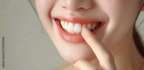 © Koplexs-Stock, Obraz premium Close up of mouth of happy woman touching the corners of her mouth, Woman smiling while touching her flawless glowy skin with copy space for your advertisement, skincare.