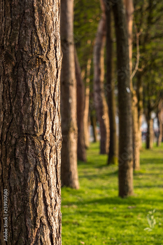 © Yi, Fototapeta premium close up of multiple straight tree trunks in the forest with green grasses on the ground