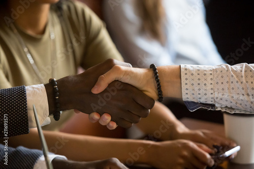 Fototapeta premium Close up of multiracial handshake at business meeting closing deal, African and Caucasian men shaking hands greeting congratulating with successful agreement, signing contract. Unity support concept