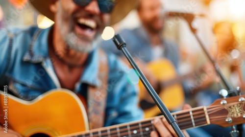 Fototapeta premium Close-up of musicians wearing denim playing acoustic guitars, captured with excellent detail on the instruments and performers, creating a lively musical scene.