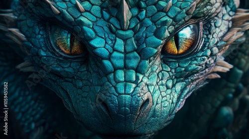 Fototapeta premium Close-Up of Mythical Blue Dragon Face with Piercing Golden Eyes, Digital 3D...
