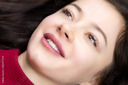 © Roman, Obraz premium close-up of naked model girls and a ready-made permanent lip makeup procedure for her