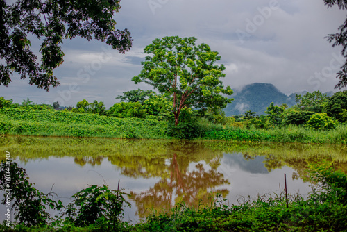 © bangprik, Fototapeta premium Close-up of natural background of various trees on high mountains and mist spreading throughout the trees as rain falls on the way.