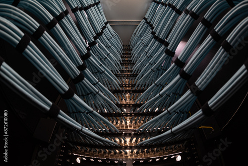 © cookiecutter, Fototapeta premium close up of network cables connected to server racks in data center room.