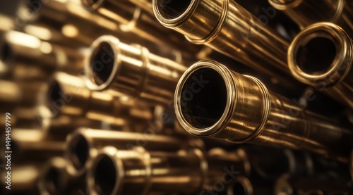 Naklejka premium Close-up of numerous gleaming brass tubes, shallow depth of field, highlighting textures and circular openings