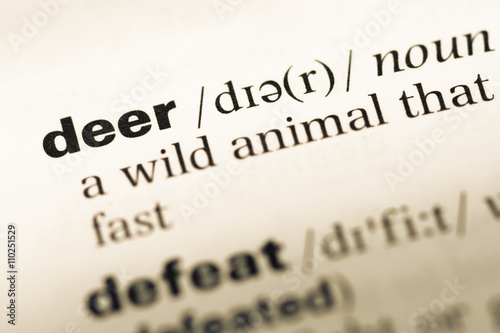 © TungCheung, Fototapeta premium Close up of old English dictionary page with word deer