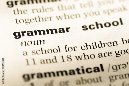 © TungCheung, Obraz premium Close up of old English dictionary page with word grammar school