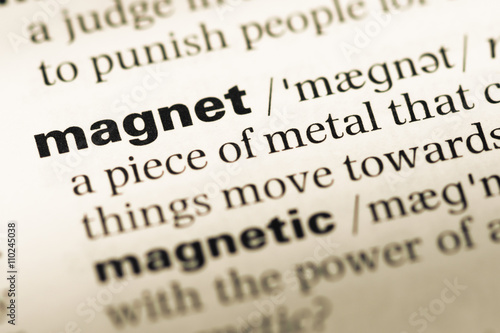 © TungCheung, Fototapeta premium Close up of old English dictionary page with word magnet