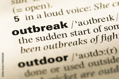 © TungCheung, Obraz premium Close up of old English dictionary page with word outbreak