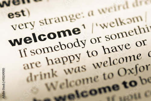 © TungCheung, Obraz premium Close up of old English dictionary page with word welcome