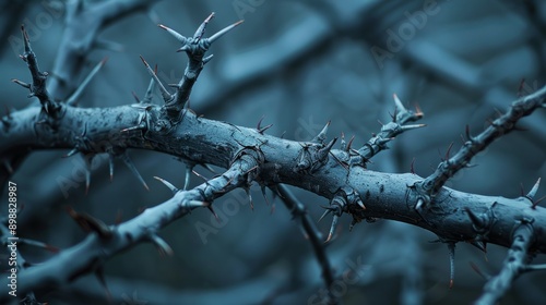 © FryArt, Obraz premium Close-up of old gray thorns on twisted branches in twilight