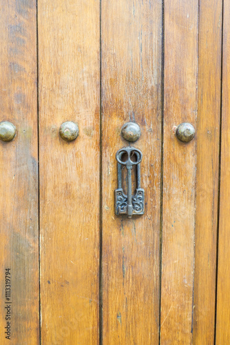Fototapeta premium Close up of old Key in wooden door at home, Brown Wood Front Door with Ornate...