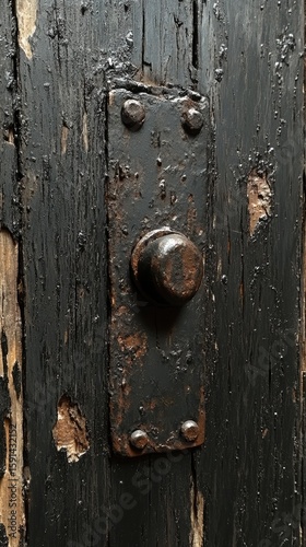Fototapeta premium Close-up of old knob and plate on worn black wooden door with aged metallic accents