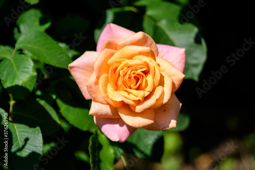 Naklejka premium Close up of one large and delicate vivid yellow orange rose in full bloom in a summer garden, in direct sunlight, with blurred green leaves in the background.