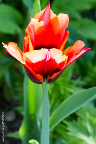 Fototapeta premium Close-up of orange and dark red tulips in spring in Normandy, France