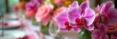 Naklejka premium Close-up of orchid flower arrangement on a beautifully decorated wedding table, event, reception, orchid
