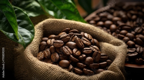 Fototapeta premium Close-up of organic coffee beans on burlap, with coffee plants in background