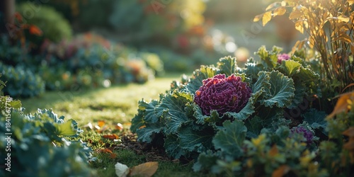 © TheWaterMeloonProjec, Fototapeta premium Close-up of ornamental Kale and Cabbage foliage used as a landscape feature, focusing on texture and color in garden beds
