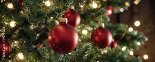 Fototapeta premium Close-up of ornaments and lights on a festive Christmas tree, detail, holiday, decorations