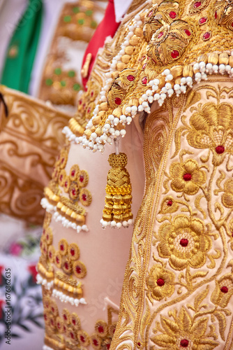 Naklejka premium Close-up of ornate gold embroidery on a matador’s traje de luces during a Practical lesson at Corrida School, Novillada. craftsmanship, culture
