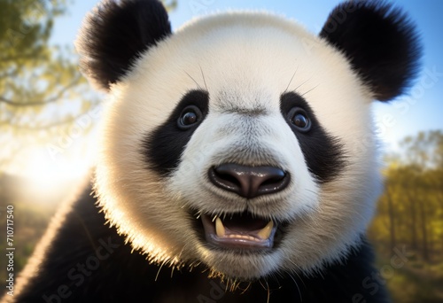 © Mickael, Fototapeta premium close up of Panda Bear in Reserve China. Panda looking at the viewer with mouth open. Endangered Species Animal Conservation. Generative ai