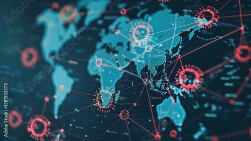 © SOEM, Obraz premium Close-up of pandemic-related icons and data points on a world map.