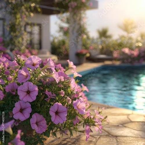 © Master, Fototapeta premium Close-up of pastel pink petunias near a pool. Sunny outdoor scene with a modern home