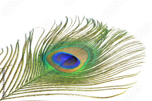 © s4sanchita, Obraz premium close up of peacock feather isolated on white