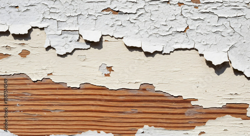 Obraz premium Close-up of Peeling White Paint on Weathered Wood Surface.