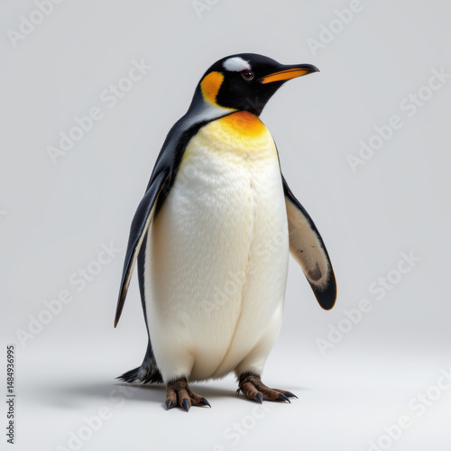 © INT888, Obraz premium Close up of penguin standing on plain background, showcasing its colorful plumage and distinctive markings with calm and curious expression