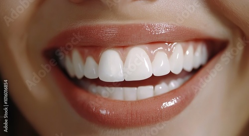 © YONG, Fototapeta premium Close-up of perfect white teeth with natural lips, close-up of a healthy smile on a beautiful female face.