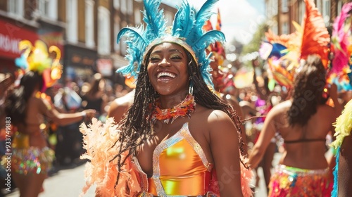 Fototapeta premium Close-Up of Performer in Vibrant Feathered Headdress at Notting Hill Carnival...