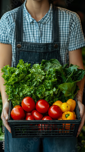 © sommersby, Fototapeta premium Close-up of person in denim overalls and plaid shirt holding black crate overflowing with vibrant, freshly harvested green lettuce, red tomatoes, and yellow bell peppers