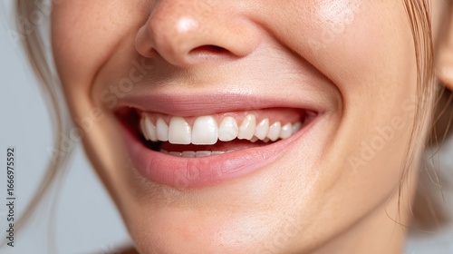 Obraz premium Close up of person smile showing healthy white teeth and smooth skin with...