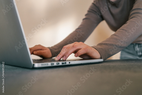 © shine.graphics, Fototapeta premium Close-up of person typing on laptop keyboard, wearing long-sleeved shirt, working at desk in indoor setting