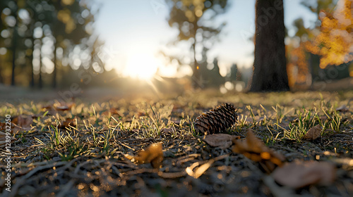 Obraz premium Close Up of Pine Cone on Grassy Ground at Sunrise