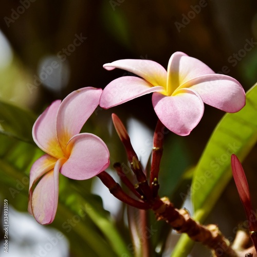 Fototapeta premium Close up of pink and yellow frangipani blossoms