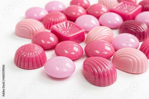 © Designer Masum, Obraz premium Close-up of pink candies on white background