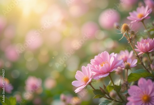 Obraz premium Close-up of pink daisy flowers in soft sunlight with a dreamy blurred...