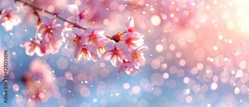 © Mikus, Fototapeta premium Close-up of pink flowers on a tree branch, with water droplets on leaves, and a blue sky behind